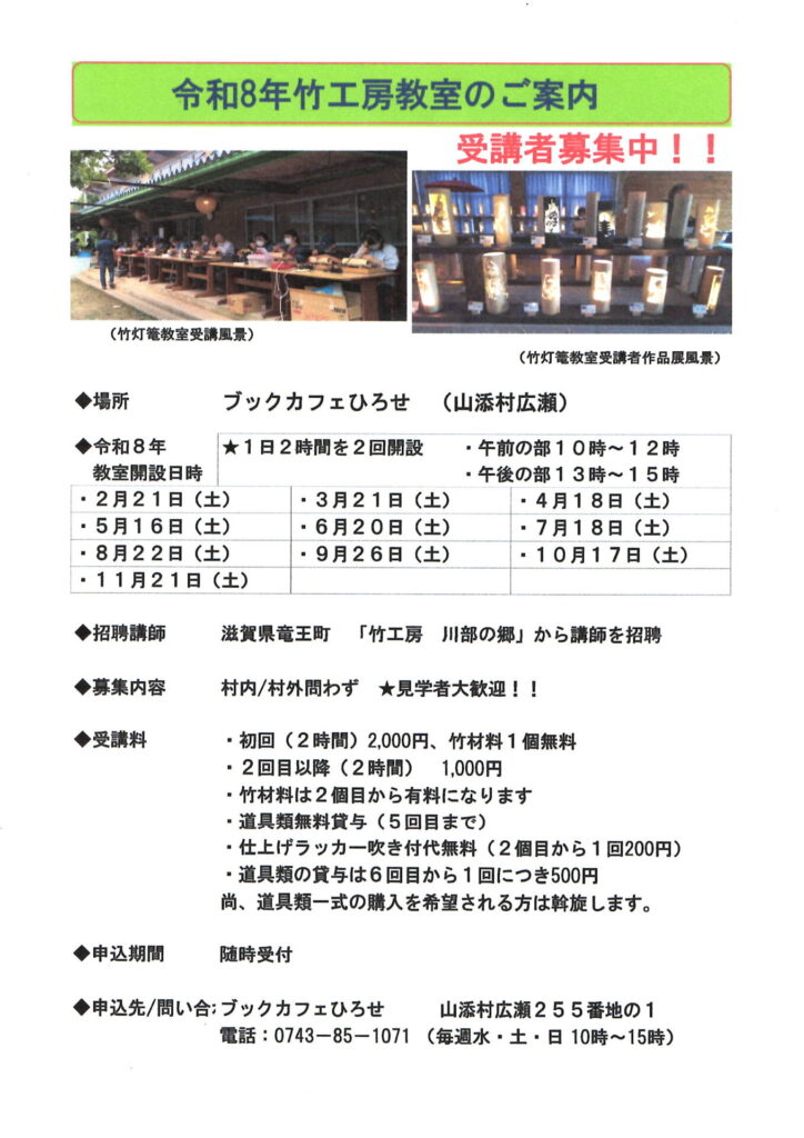 竹工房教室のご案内 投稿日 2025年12月25日 著者 yamazoekanko カテゴリー NEWS ブックカフェひろせでは、令和8年度「竹工房教室」がはじまります。EPSON MFP imageブックカフェひろせ ℡0743-85-1071(毎週、水・土・日 10時~15時)